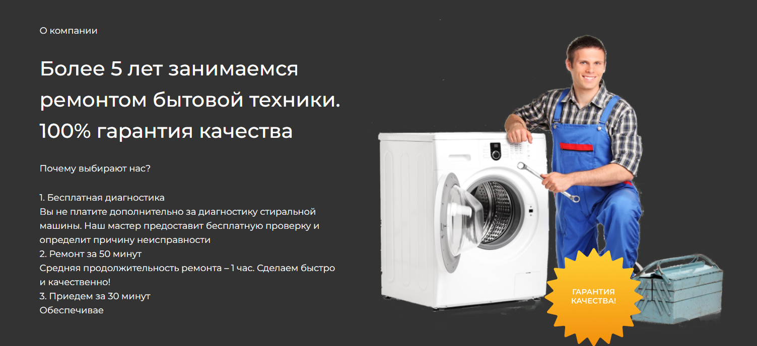 1. Заголовок - основная информаци о компании Пример: Более 5 лет занимаемся ремонтом бытовой техники. 100% гарантия качества