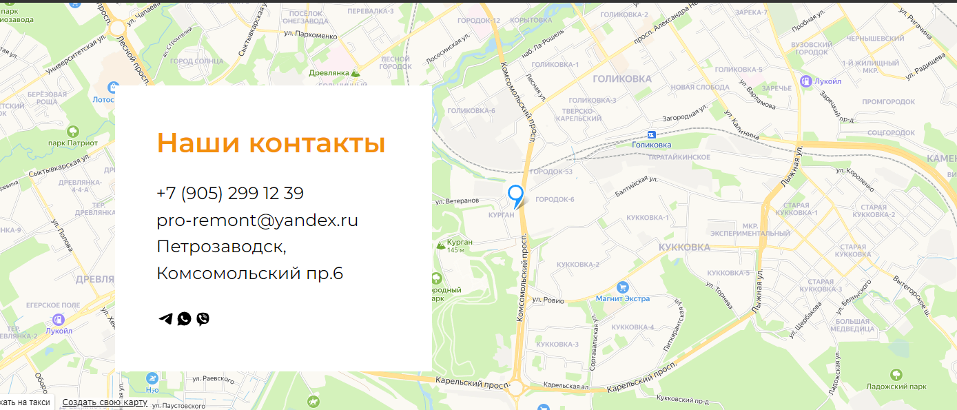 В данном блоке мы размещаем контактную информацию об организации и карту. Клиентам это необходимо для понимания, что у организации есть конкретный магазин или офис, куда в случае чего он может обратить.