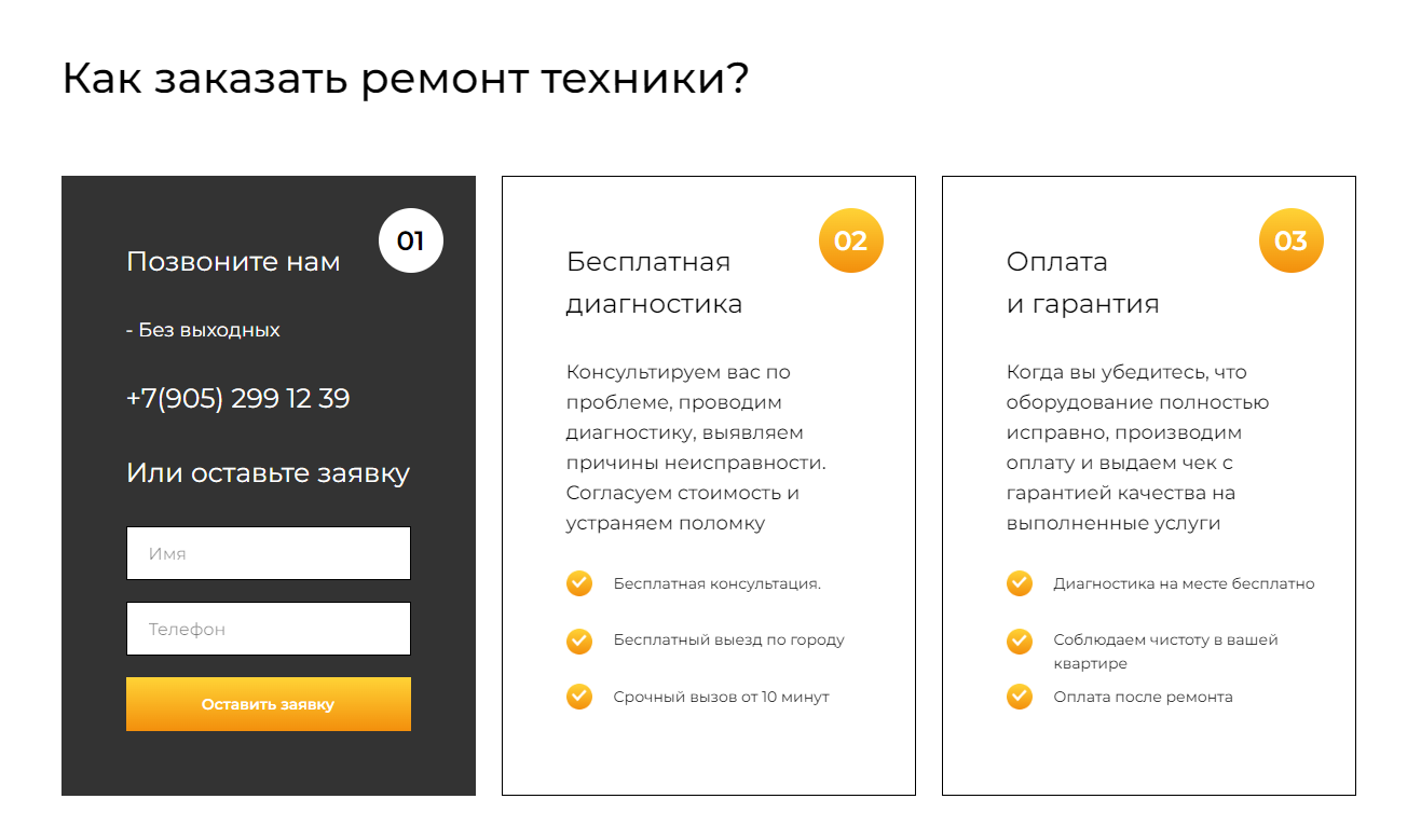 2. Несколько слайдов или элементов которые последовательно отображают алгорим действий Пример: Бесплатная диагностика, гарантия